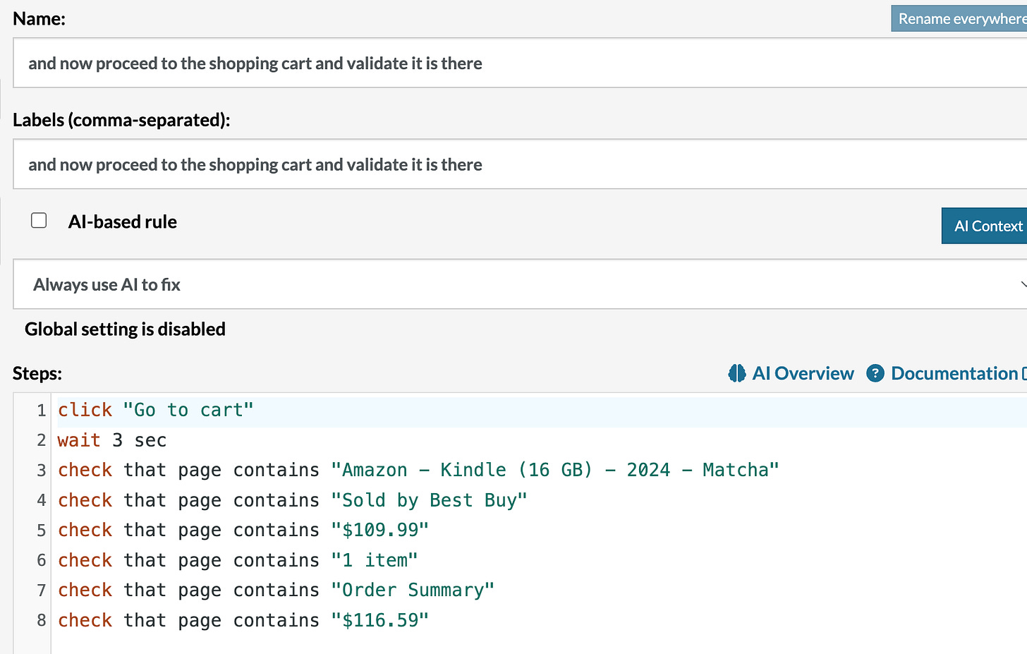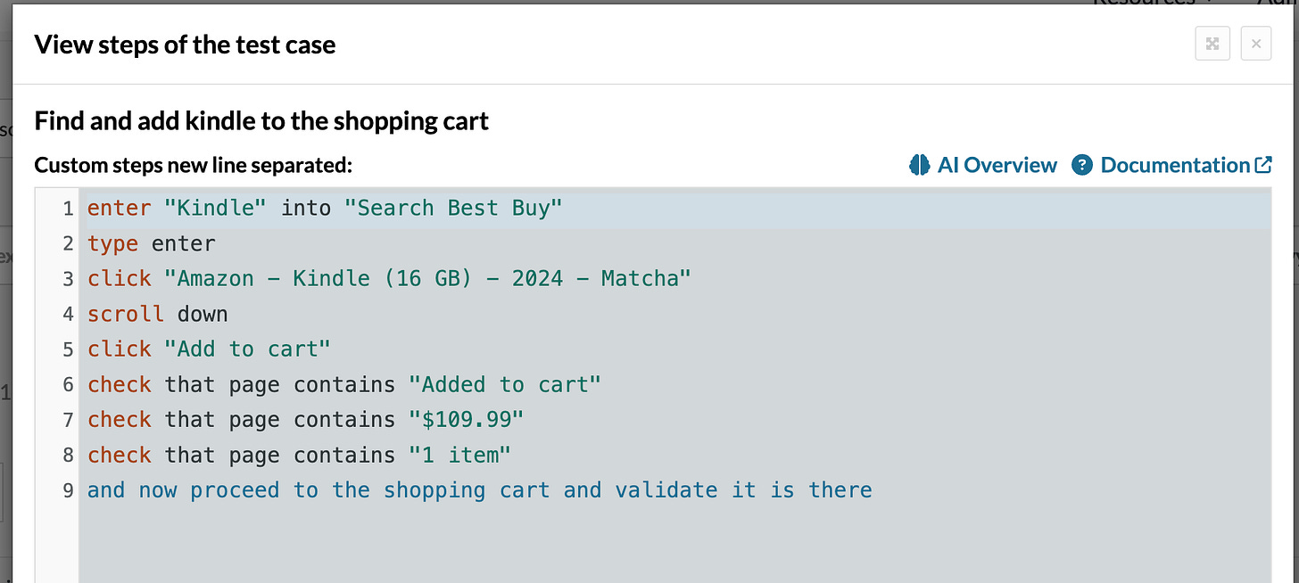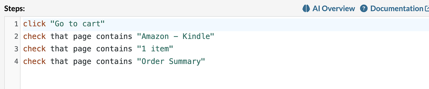 The QA Engineer can review and correct the generated steps. When AI “hallucinates”, the QA Engineer can manually correct steps. After the QA Engineer’s cleanup, here’s the updated test: