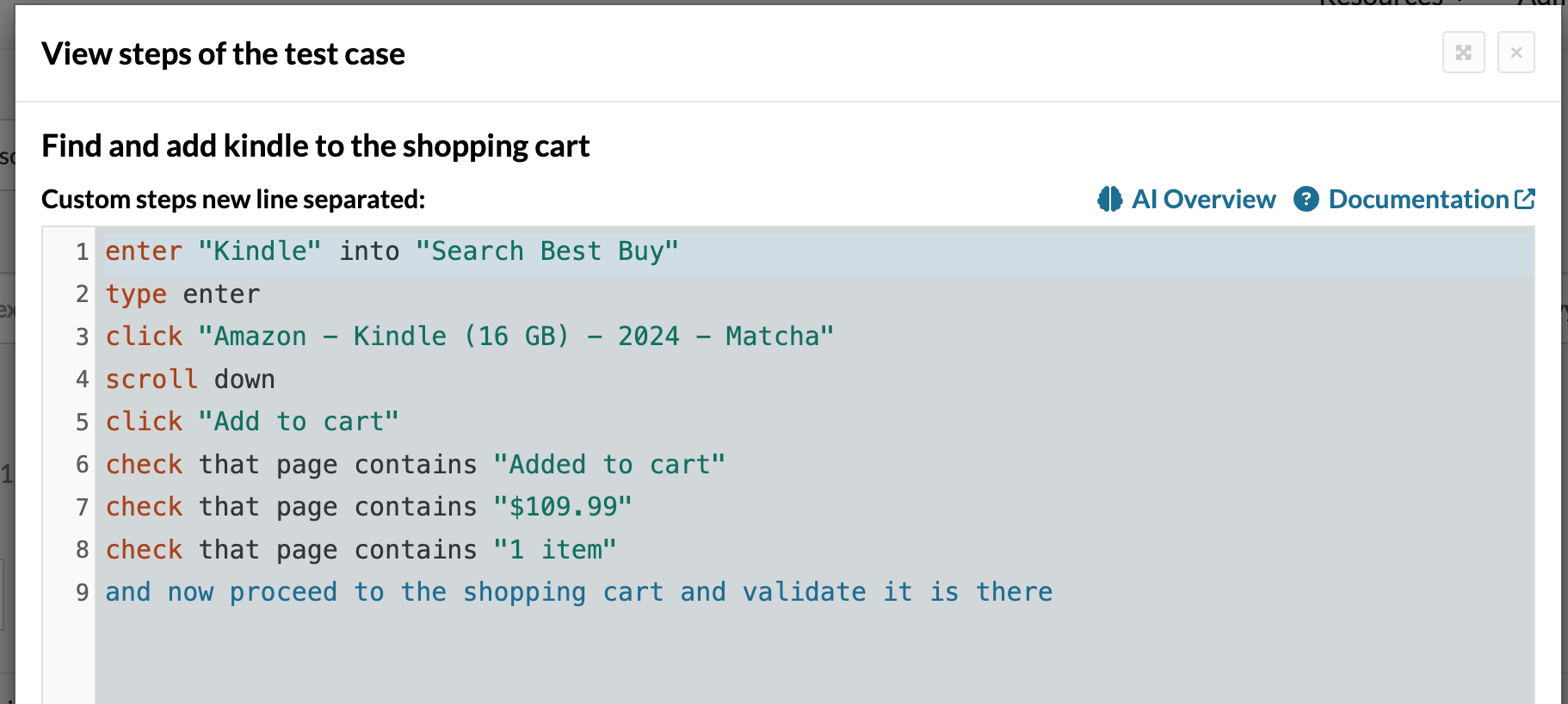 We can view and edit the imported tests, e.g., ‘Find and add Kindle to the shopping cart’:
