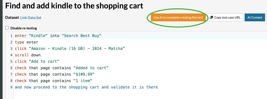 However, when a step is not recognized (e.g., the last one), we can fall back to AI by clicking “Use AI to complete creating this test”: