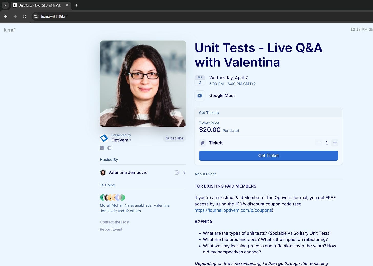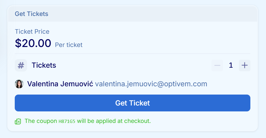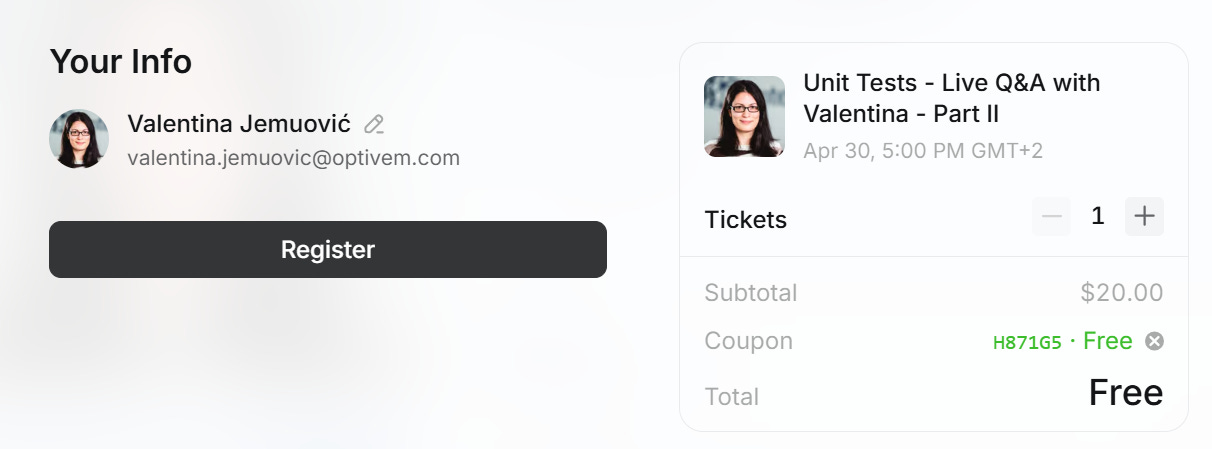 Discount FAQHow to redeem your discount?Valentina JemuovićJun 05, 202553ShareHow to use your 100% discount coupon?(1) Click on the “Registration Link”.You should see the Event page(2) Click on the “Get Ticket” button(3) Click on “Register“It’s not working. Can you help me?If you’re not able to register with the coupon, send me a message:Message Valentina JemuovićPreviousNext