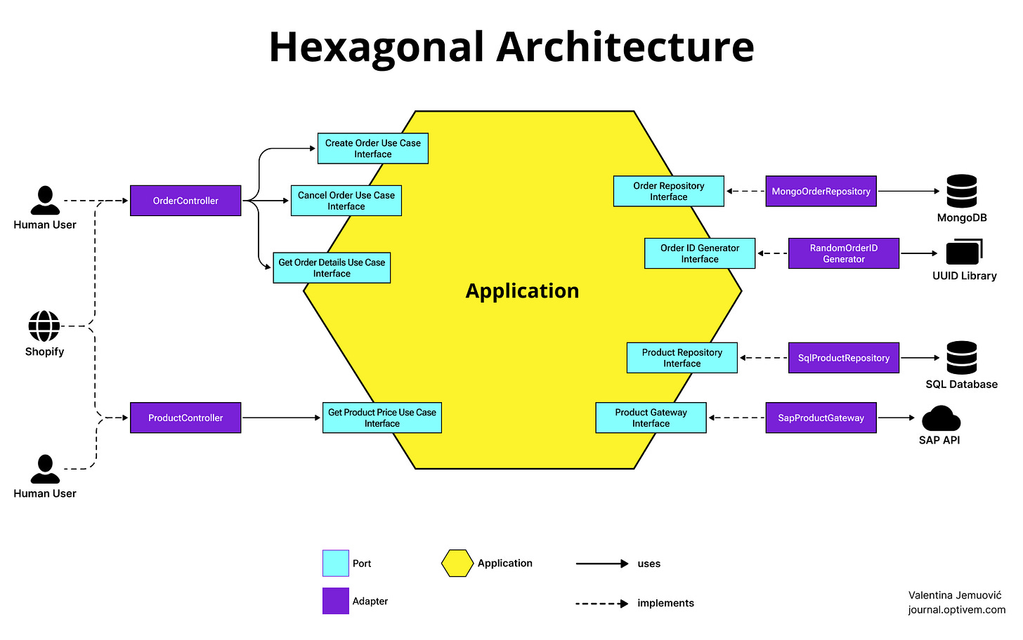 OrderRepositoryinterface, e.g. by executing SQL queries on an SQL database, or perhaps by using an ORM, etc.Email Adapter implementing