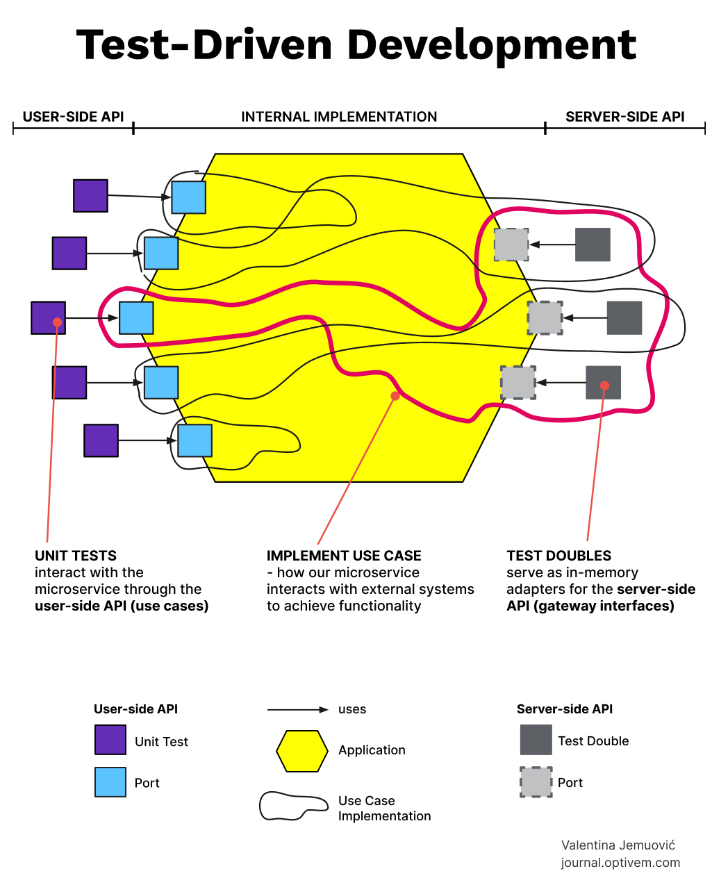 Server-side api: We “mock out” the driven (outgoing) ports, so that we’re excluding DB, external APIs, etc. In this way, the use case depends on interfaces of the external world, and doesn’t know (or care) about concrete implementations