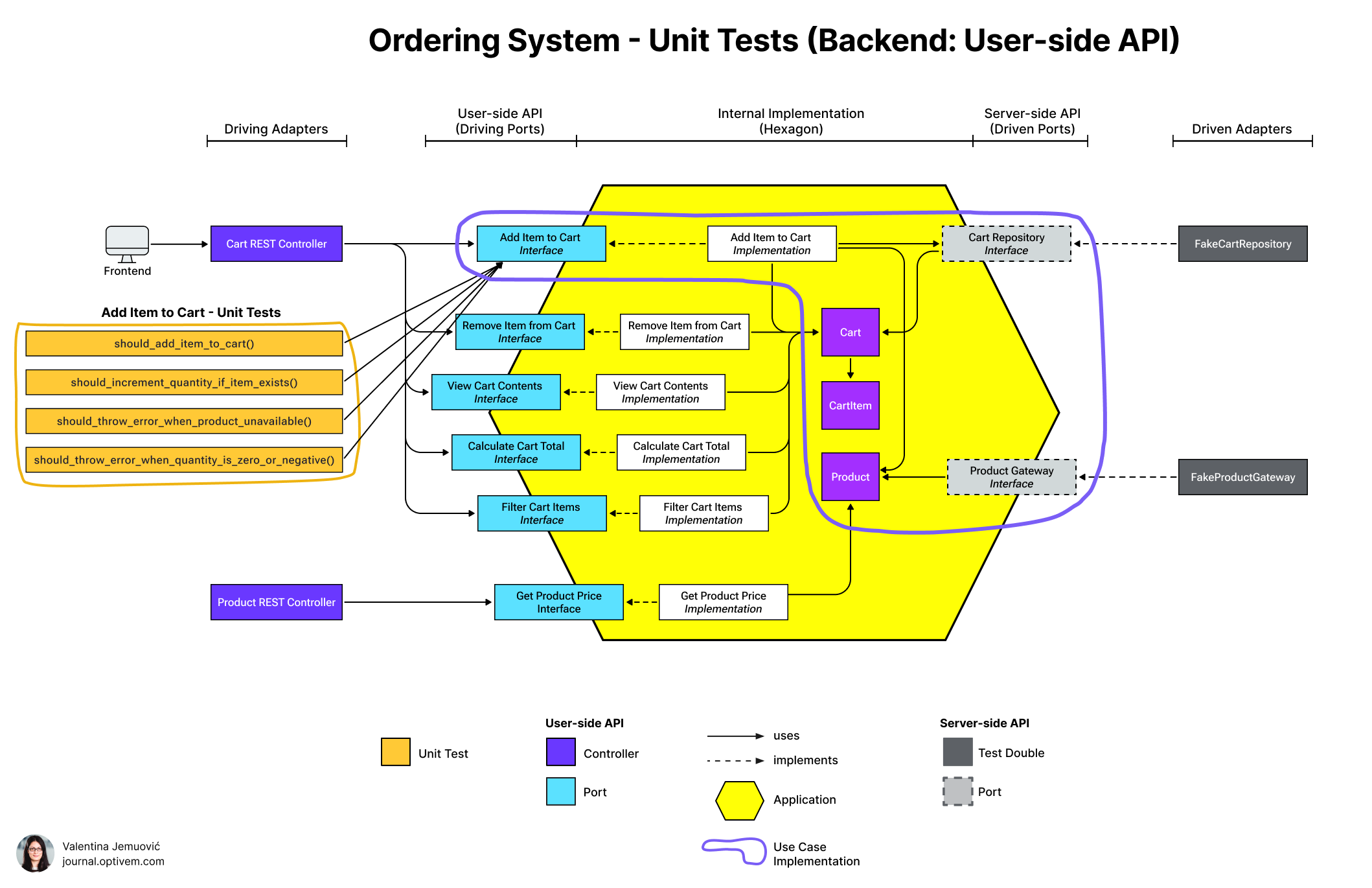 For an e-commerce system, suppose we have a frontend and a backend. We model the backend using Hexagonal Architecture. Let’s see what the user-side API looks like on the backend: