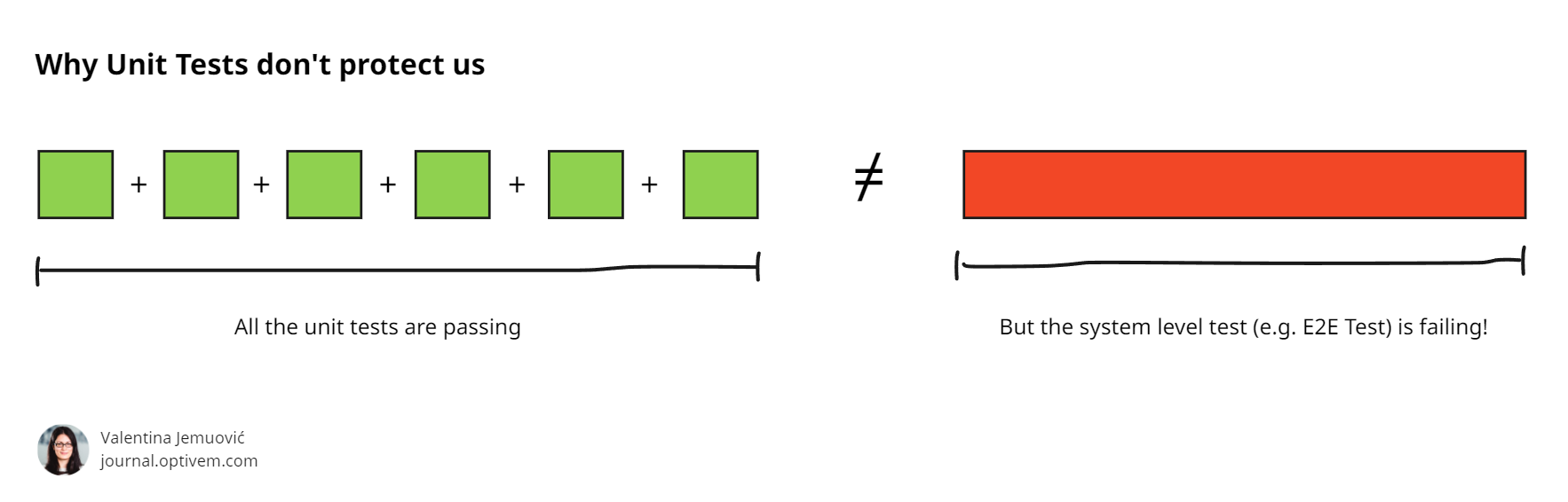 Unit tests don’t protect us against regression bugs because they cover only Business Logic. They don’t cover I/O and Presentation Logic, and they don’t cover the whole user flow. That’s why you can have hundreds of thousands of tests passing, 100% code coverage… but coverage is only for business code logic, not infrastructure or presentation logic.